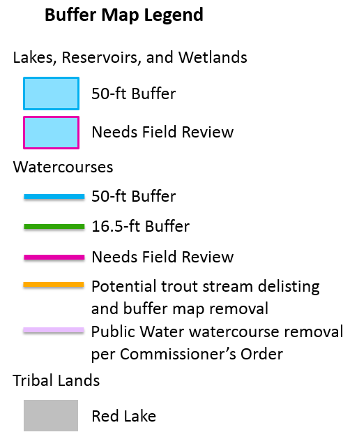 This application shows the statewide Buffer Protection Map. It represents the minimum state buffer standards in the buffer law (MN Statute 103F.48). Landowners must also comply with local ordinances, which may be more restrictive than the buffer law. The map is intended to help users locate waters that require buffers, based on Minnesota's buffer law. It does not replace on-the-ground verification and delineation of buffer locations. The State does not have the legal authority to enforce the requirement of Minn. Stat. ยง 103F.48 on tribal land holdings. For purposes of the buffer certification program, tribal land holdings means all tribal land located within the boundaries of a federally recognized Indian Reservation and all lands held in trust by the federal government on behalf of a federally recognized Indian Band. Other exemptions to the buffer law are not displayed on this map. The map was created from two sources of data: the Public Waters Inventory (PWI) and a public ditch layer created from data provided by local drainage authorities. This map does not replace the PWI maps. Every reasonable effort has been made to ensure the accuracy of the data on which this map is based. However, the Department of Natural Resources does not warrant the accuracy, completeness, or any implied uses of these data. This map was compiled and generated using geographic information systems (GIS) technology. GIS data products are available from the MN Geospatial Commons. Public waters that were mapped as requiring a 50-ft. (avg.) buffer at the time the buffer law was passed will not be re-mapped if they subsequently become part of a public drainage system. The map will continue to show them as requiring a 50-ft. (avg.) buffer. This map is subject to change as of the date listed and will be periodically updated. If you believe the buffer map is incorrect, please work with your local Soil and Water Conservation District to clarify the issue and direct your concern to the appropriate person for resolution.